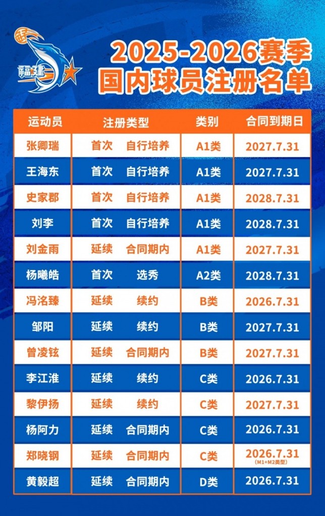 截止8月31日,经CBA公司审核并完成注册公示,福建SBS浔兴俱乐部已完成2025-2026赛季CBA联赛国内球员注册工作,14名球员将身披福建战袍征战新赛季!