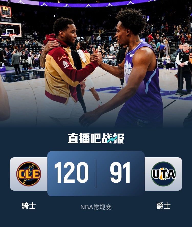比赛开始,骑士众将发力打出不错开局,随后接连外线发炮领先到双位数,凯斯勒里突外投强势止血,朱赞三分再中爵士首节追到差6分,次节塞克斯顿接连突破一波8-0一度助队反超比分,骑士短暂断电后阿伦内线给出回应,双方展开拉锯战,次节双方打平。下半场,爵士突然断电4分钟内一分未得,骑士多点开花,外线也回暖打出23-4超级攻击波一举拉开20分以上领先,末节爵士连续5记三分追分,但骑士总能回应守住20分以上领先,双方随后练兵,最终骑士120-91轻取爵士,终止4连败。