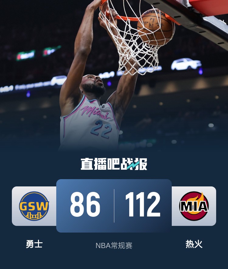 比赛开始,热火先打出7-0开局,巴特勒拿到勇士首分,双方命中率都不高,希尔德和桑托斯连续命中三分助勇士咬住比分,阿德巴约单节13分带领热火首节领先6分,次节希罗里突外投助热火拉开双位数领先,阿德巴约三分再中扩大领先,勇士首发还是不在状态,希罗压哨三分半场领先17分。下半场,阿德巴约继续发力带队拉开20分以上领先,巴特勒连砍4分止血,双方展开对攻战,热火4分多钟一分未得,勇士一度追到个位数分差,末节勇士进攻端再受阻,热火连续三分一波15-5重新领先到20分以上,随后双方换上替补练兵,最终热火112-86轻取勇士。