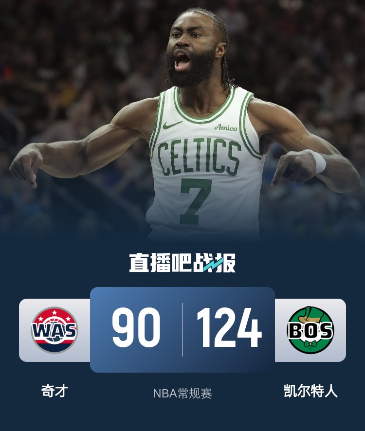 比赛开始,绿军连续外线发炮轰出8-0开局,奇才全民皆兵止血,霍勒迪和霍福德连续三分拉开双位数领先,奇才外线各种打铁,首节绿军领先16分,次节绿军外线继续发炮拉开20分以上领先,随后面对奇才追分绿军外线总能回应,半场凯尔特人领先21分。下半场,双方展开拉锯战,谢尔曼上来接连三分,凯尔特人连续外线4记三分轰出14-0直接领先到30分以上,末节双方几乎换上替补练兵,凯尔特人还是牢牢保持住30分以上领先,最终凯尔特人124-90轻取奇才。