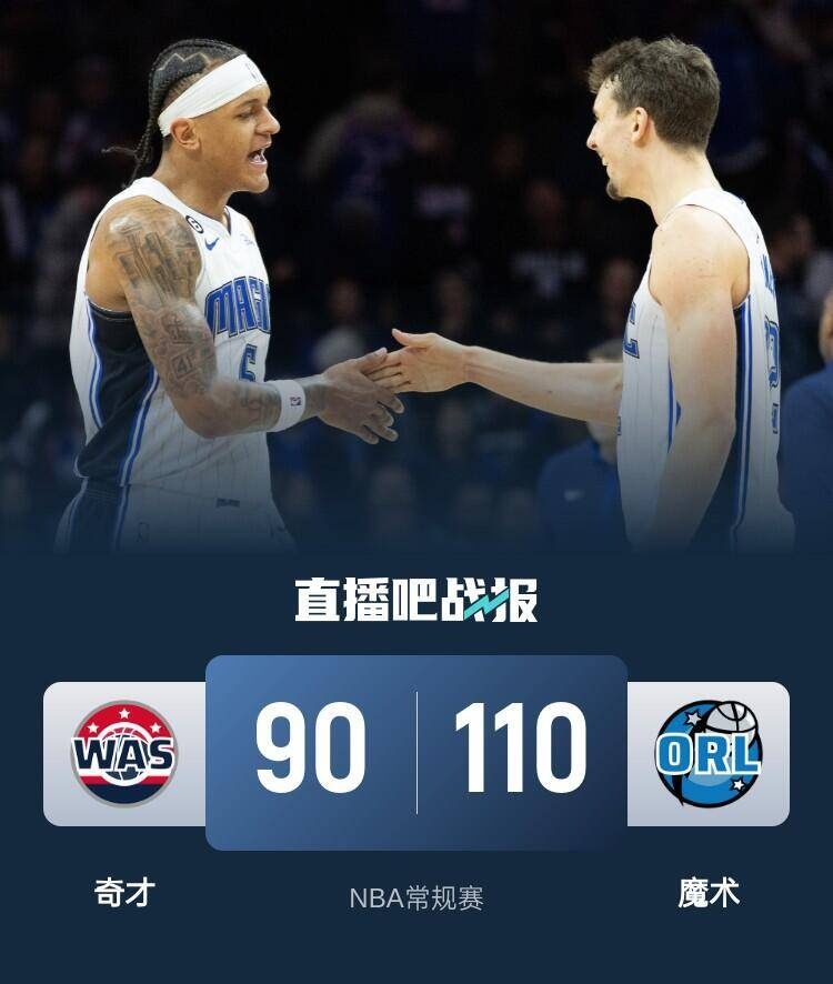 开场后两队你来我往打得十分胶着,班凯罗多次制造犯规获得罚球机会,奇才外线连中三分取得微弱优势。第二节上来奇才打得比较混乱,不过魔术表现也不够理想,在第二节尾声小瓦格纳攻防建功帮助魔术以2分优势结束上半场。易边再战,魔术突然爆发,他们一波17-0的攻势直接拉开比分,虽然奇才迅速回敬一波反扑,但暂停调整后魔术再度掀起攻势将分差拉大,第四节场上分差已经来到20分以上,比赛失去悬念,最终魔术110-90轻松击败奇才,奇才遭遇6连败。