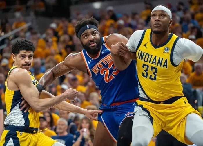 这有点反常识,大量摆中锋,特别是第四节唐斯上来之后,尼克斯的换防表现依旧还行。虽然哈利伯顿持球一对一的能力相对弱一些,不过,第四节连续三次进攻,哈利抓到错位后都甩给队友,这个选择还是值得商榷。