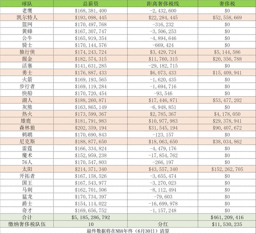 太阳1.52亿领衔10支奢侈税球队️其余每队分红1140万