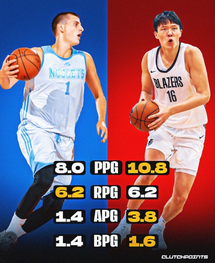 7月20日讯 今天,美国知名媒体ClutchPoints发文对比杨瀚森和约基奇夏季联赛的表现。