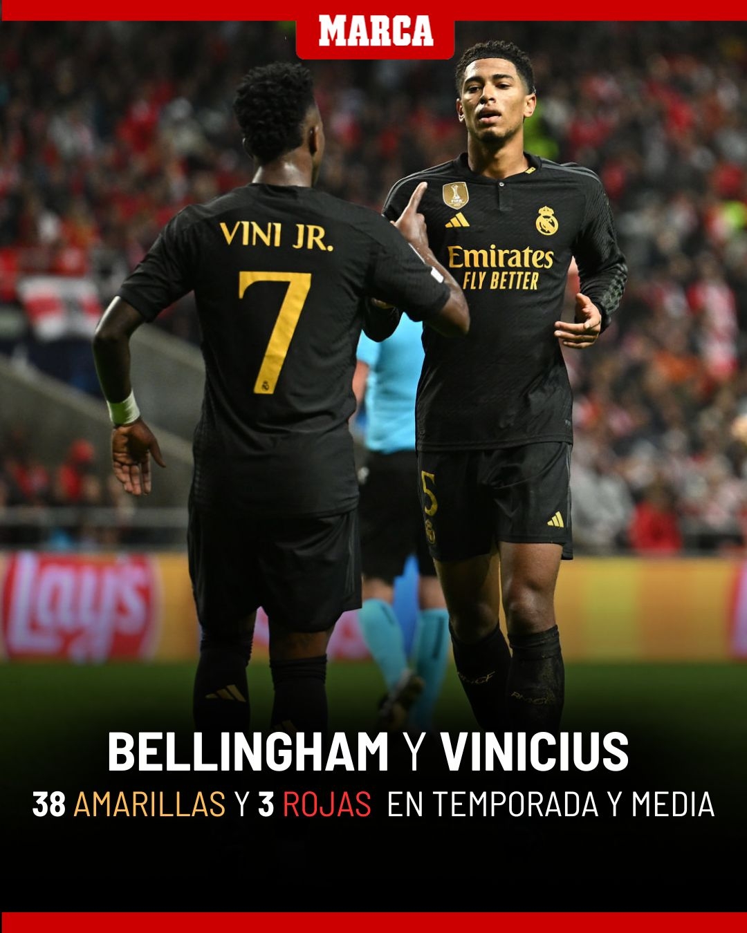 《马卡》报指出,维尼修斯和贝林厄姆如今面临着相似的问题,两人作为进攻型球员受到的处罚过多。过去一个半赛季里,他们一共创造了116次进球和助攻,然而同期却在各项赛事里被出示了共计38张黄牌和3张红牌。