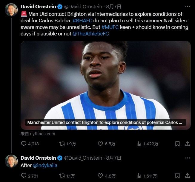 08月13日讯 8月7日,The Athletic名记奥恩斯坦爆出曼联问价巴莱巴的转会新闻后,表示这一消息首先由博主indykaila(绿帽哥)爆料,引发外网热议,该条动态近2000万次观看。近日,奥恩斯坦在做客播客节目时,首度回应了此事。
