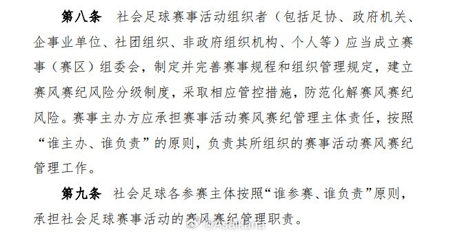 当然了,但凡对中国足协职责有点了解,懂点新体育法的,或者看过这个文件的,都不至于想出个这么搞笑的联系。因为这个文件出台背景是苏超诞生之前的事情,里面甚至白纸黑字规定了分好了中国足协和地方足协、社会办赛方的权利义务,甚至规定地方赛事主办者才是赛风赛纪第一责任人,广大球迷深恶痛绝的赛风赛纪问题现在捋顺了明确的职责分工,反而对苏超这类社会赛事来说是个大大的好事。