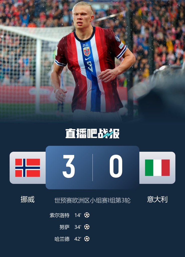 与挪威同组的意大利,目前4战3胜1负,净胜球只有5个,他们输球的场次是0-3不敌挪威。世预赛已经过半,挪威直通的概率非常大,但四星意大利可就麻烦了。意大利想要超过全胜的挪威,净胜球劣势太大使得他们只能期盼挪威犯错。若是最终名列第2,意大利将再次参加附加赛,而蓝衣军团已经连续两届倒在附加赛了。