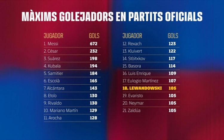 巴萨队史射手榜:梅西672球居首 莱万追平内马尔位列第18