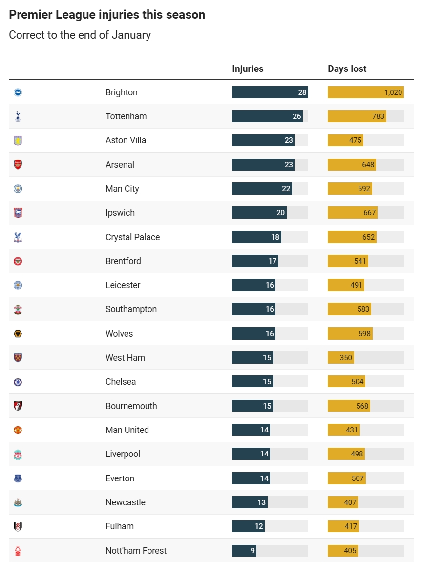 02月11日讯 泰晤士报罗列了英超各俱乐部本赛季的伤病情况。截至1月,布莱顿和热刺是本赛季伤病最严重的球队,维拉、阿森纳、曼城紧随其后。