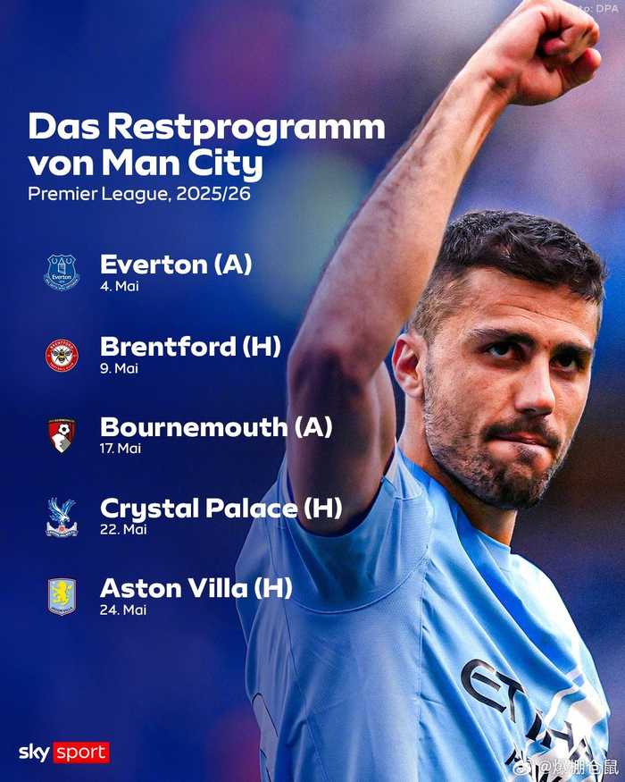 曼城阿森纳同分争冠,最后5轮赛程出炉