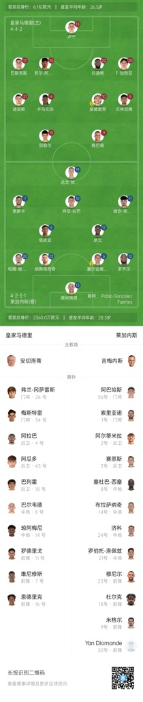 皇马替补:26-弗兰-冈萨雷斯、34-梅斯特雷、4-阿拉巴、7-维尼修斯、8-巴尔韦德、11-罗德里戈、14-琼阿梅尼、16-恩德里克、18-巴列霍、43-迭戈-阿瓜多