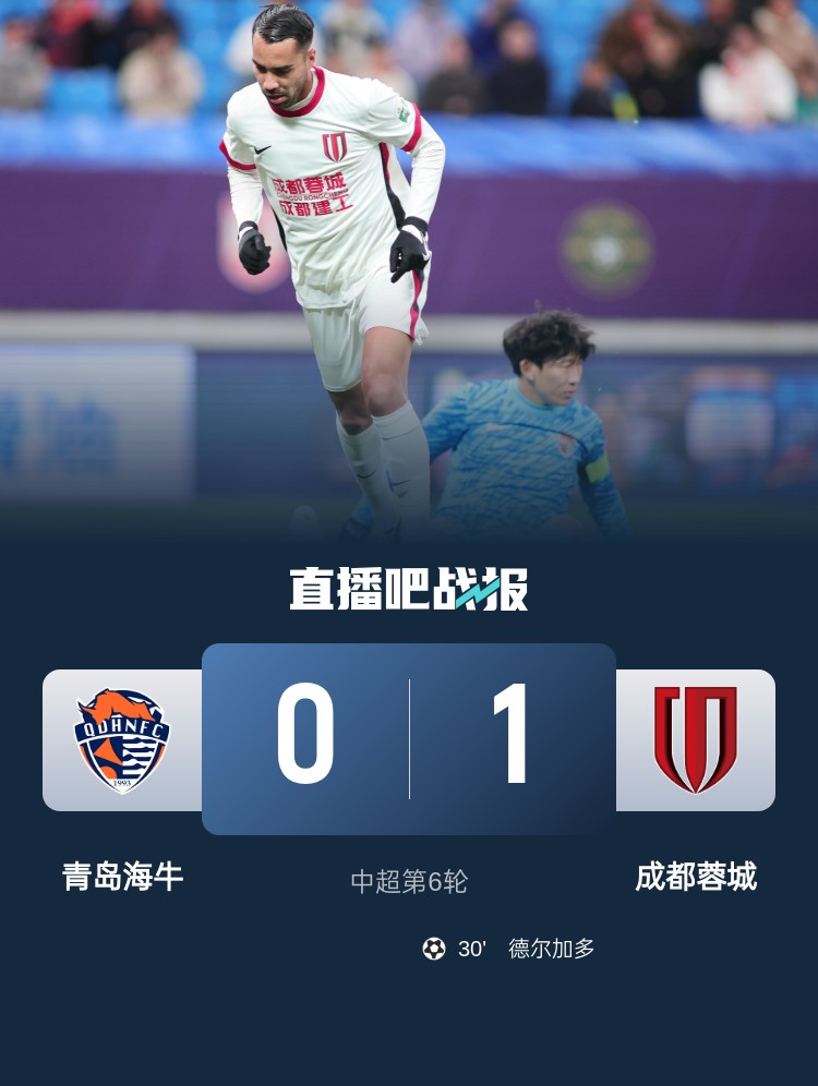 4月12日讯 北京时间4月12日19点,中超第6轮,青岛海牛在主场青岛青春足球场迎战成都蓉城。上半场,牟鹏飞脚滑送礼,德尔加多破门。下半场,罗慕洛射中立柱。最终成都蓉城1-0青岛海牛。本场比赛过后,在先赛的情况下,成都蓉城以13分排在联赛第二,青岛海牛积2分排联赛倒数第二。