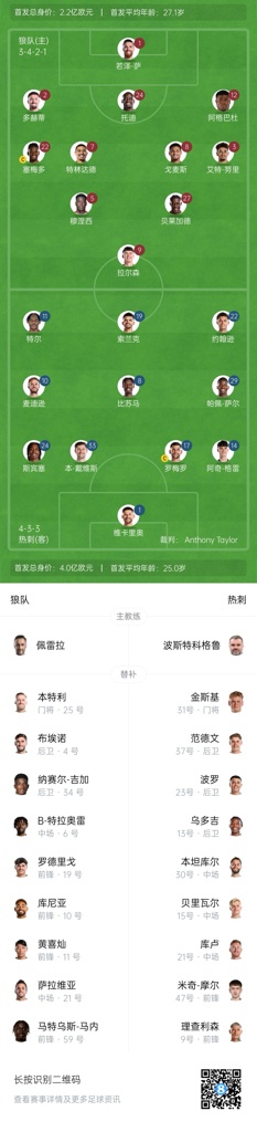 积分榜方面,热刺上轮3-1战胜南安普顿终结4轮不胜,目前积37分排在联赛第15位;狼队则是三连胜,目前积32分排在倒数第四,高出降级区12分。