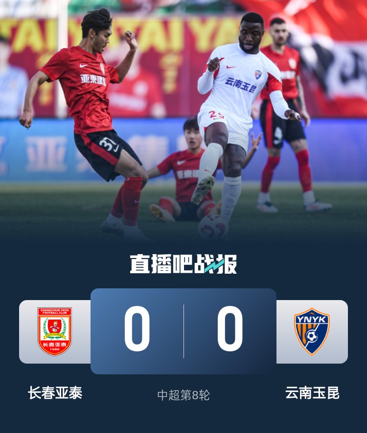 全场比赛结束,长春亚泰0-0云南玉昆。
