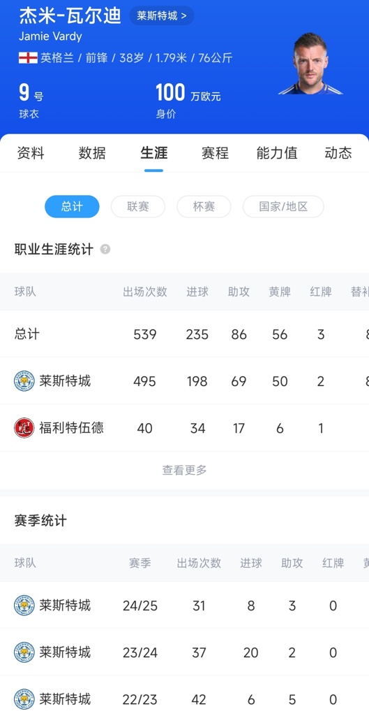 本赛季38岁的瓦尔迪依旧是莱斯特城阵中的最佳射手,出战31场比赛,贡献8粒进球和3次助攻。效力莱斯特城13年时间,瓦尔迪已经代表蓝狐出战了495场比赛,打进198球并送出65次助攻。2015-16赛季,瓦尔迪随队缔造蓝狐童话,夺得英超联赛冠军。2019-20赛季,瓦尔迪在当赛季英超打入23球,夺得英超金靴。