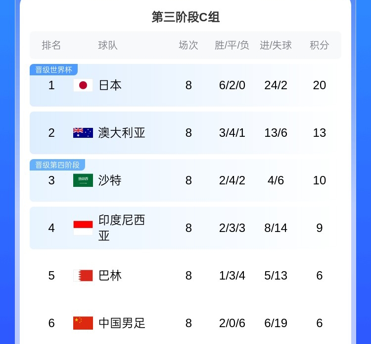 国足所在的C组,日本20分一骑绝尘,提前三轮锁定世界杯资格,他们也是除了东道主之外第一支锁定世界杯参赛名额的球队。目前澳大利亚积13分排名第二,如果他们本轮战胜日本,且沙特不胜,澳大利亚也将锁定直通名额。