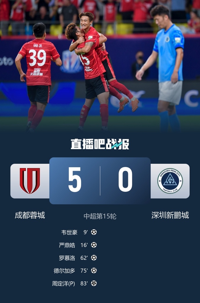 6月25日讯 北京时间20:00,中超第15轮成都蓉城vs深圳新鹏城,比赛在凤凰山足球场打响!上半场,韦世豪单刀破门,随后助攻严鼎皓再下一城!近2轮韦世豪2球2助!下半场,罗慕洛再下一城同样完成传射;安永佳头球中横梁;严鼎皓助攻也完成传射,德尔加多破门!张晓彬送点,周定洋点射建功!最终,成都蓉城5-0击败深圳新鹏城,近3轮联赛首胜!