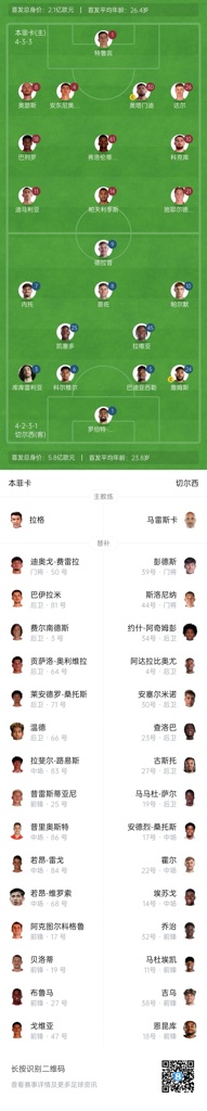 切尔西替补:39-彭德斯、44-斯洛尼纳、4-阿达拉比奥尤、19-马马杜-萨尔、23-查洛巴、27-古斯托、30-安塞尔米诺、34-乔什-阿奇姆彭、14-埃苏戈、17-安德烈-桑托斯、22-霍尔、11-马杜埃凯、18-恩昆库、32-乔治、38-吉乌