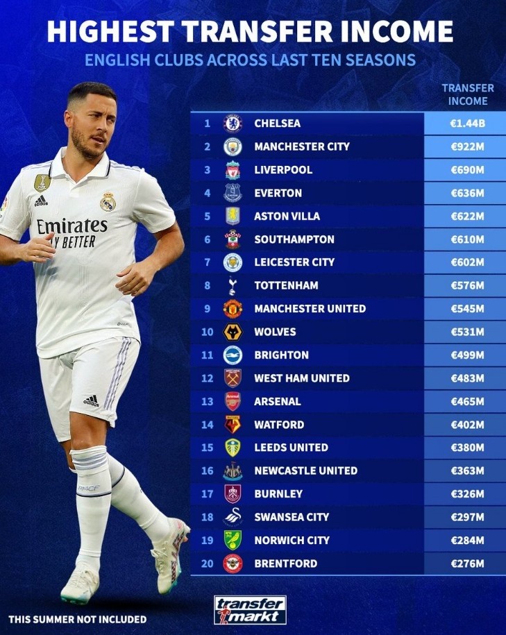 英格兰球队近10个赛季卖人收入榜:切尔西14.4亿欧居首,曼城次席