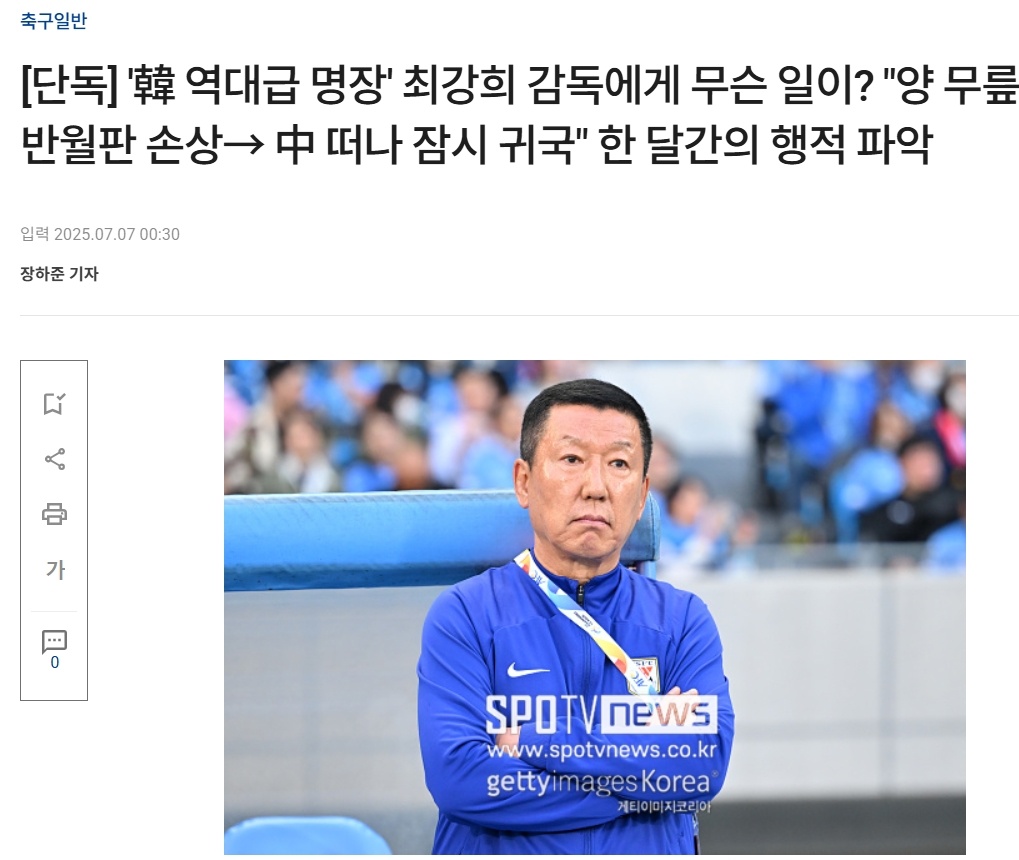 07月07日讯 山东泰山主帅崔康熙上周返回韩国,其经纪公司三度发文表达不满,引发外界热议。韩国媒体SPOTV今日发布独家文章,宣称了解到了崔康熙过去一个月的情况。