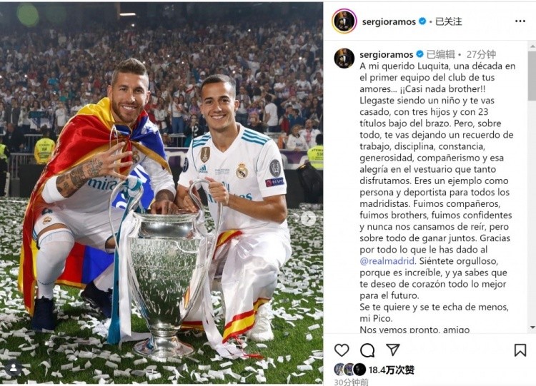 拉莫斯社媒晒出与巴斯克斯在皇马时期的合照,配文:“亲爱的卢卡斯,在你心爱的俱乐部一线队度过了十年时光……这可真不容易啊,兄弟!你来的时候还是个少年,如今离开时已为人夫,育有三个孩子,怀揣23座奖杯。更重要的是,你留下了勤奋、纪律、坚持、慷慨、团队精神以及更衣室里那份我们都如此享受的欢乐。作为一个人和运动员,你是所有皇马人的榜样。