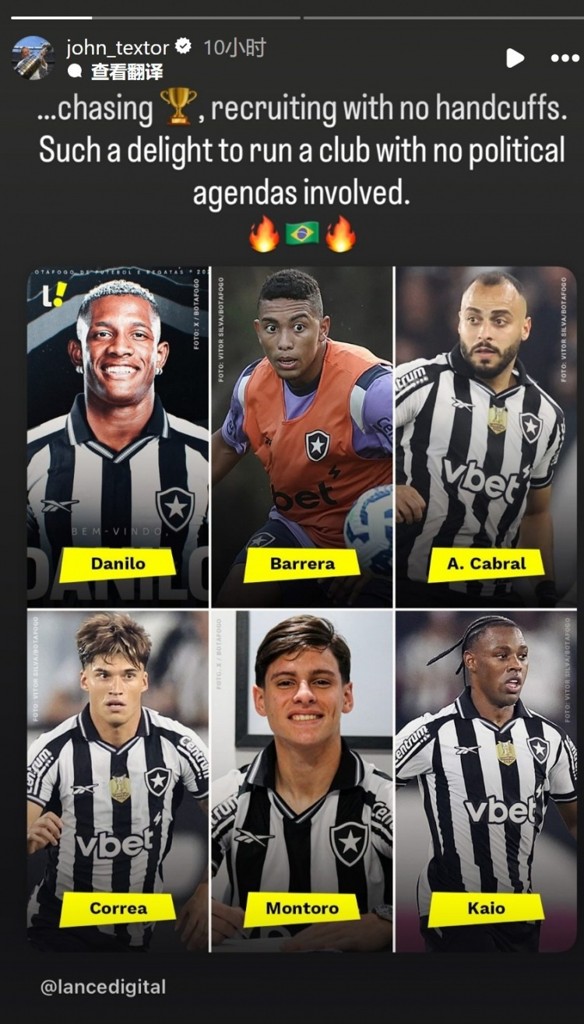 特克斯托社媒转发旗下俱乐部博塔弗戈的引援动态,配文:“追逐奖杯,无拘无束地引援,经营一家没有政治议程牵涉的俱乐部真是一种享受。”
