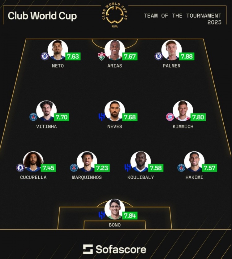 7月14日讯 世俱杯已经完赛,sofascore也统计了本届赛事评分最佳阵,切尔西、巴黎和利雅得新月各3将入围。