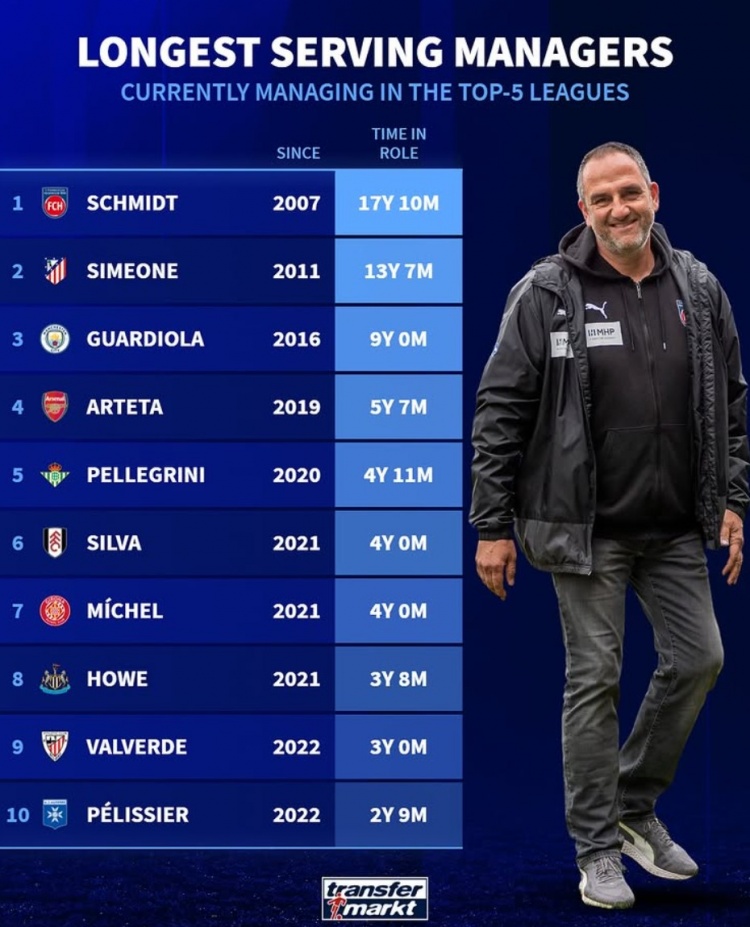 7月26日讯 《转会市场》统计了五大联赛当前执教同一球队最长时间榜,海登海姆的主帅施密特居首。